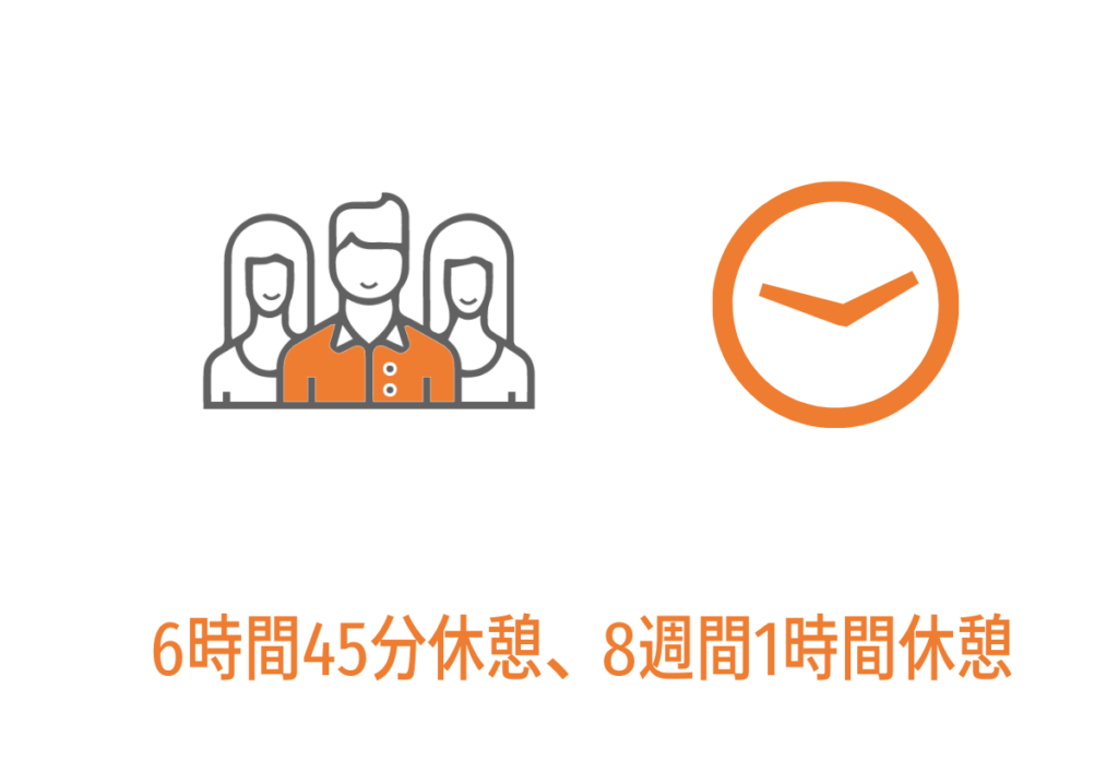 - 使用者は、労働時間が6時間を超える場合は45分以上、8時間を超える場合は1時間以上の休憩を与えなければいけません。