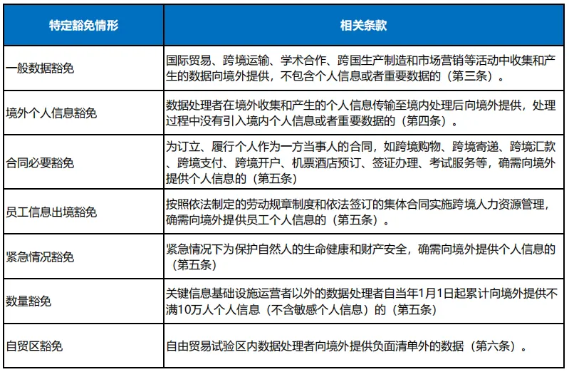 此外,企业最为关注的是《规定》对特定场景个人信息出境活动免于全部合规程序的一些“豁免”情形,企业如满足“豁免”相关条件,则无需采取任何一项前述合规程序(即申报安全评估、订立标准合同、通过认证)。这些豁免情形集中在《规定》的第三条至第六条,包括: