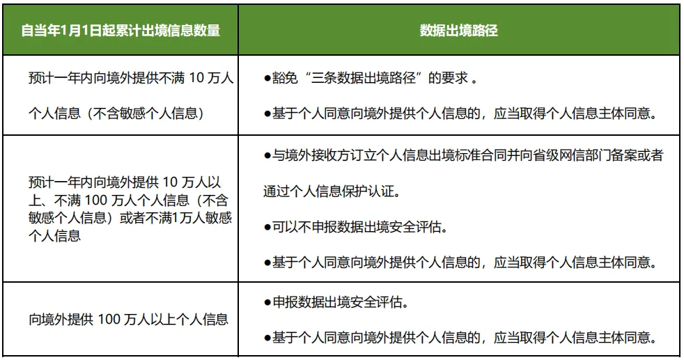 在判断适用的合规程序时,累计出境个人信息的数量是一个重要的影响因素。《数据出境安全评估办法》、《个人信息出境标准合同办法》均将企业出境个人信息数量统计的起算时间定为“上年1月1日”,而《规定》则将这一时间点改为了“当年1月1日”。