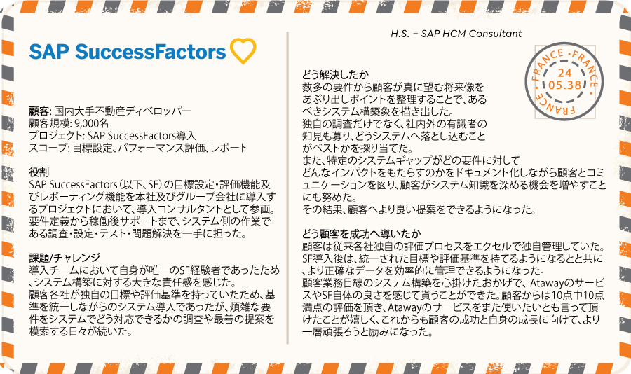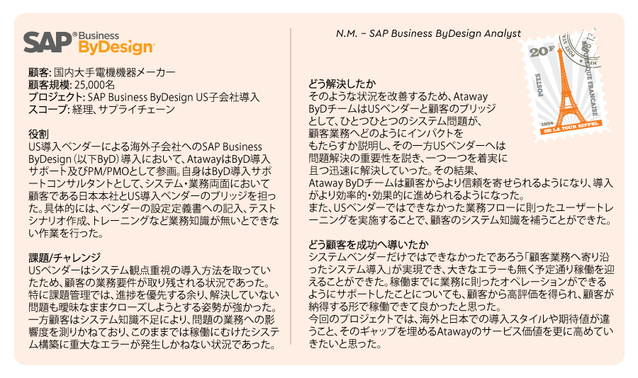 アタウェイは、ERP導入コンサルティングやチェンジマネジメントなど、顧客の業務改革につながるコンサルティングサービスを提供しています。アタウェイコンサルタントがどんな仕事をし、何を成し遂げているのか、是非目を通してみてください。あなたのやりたいことが、見つかるかもしれません。