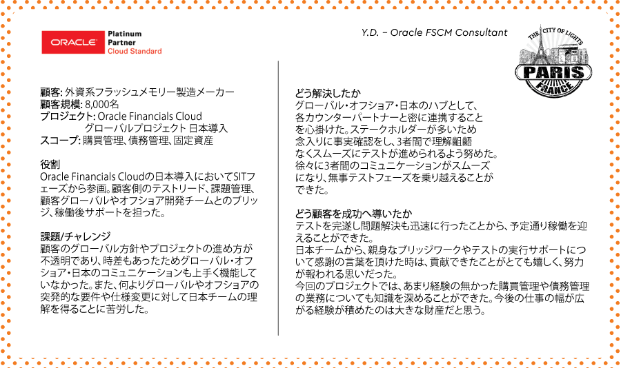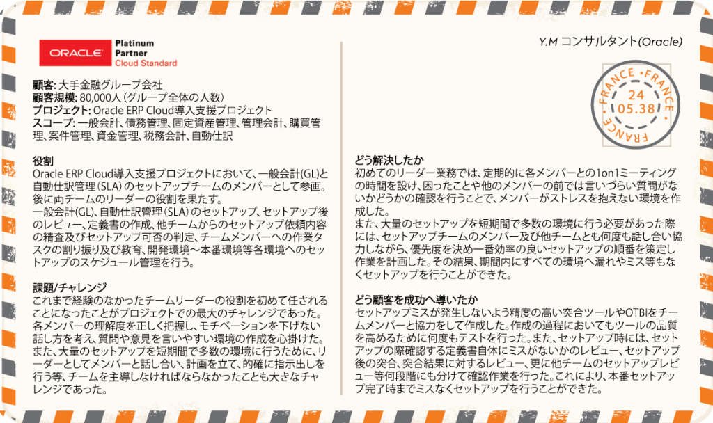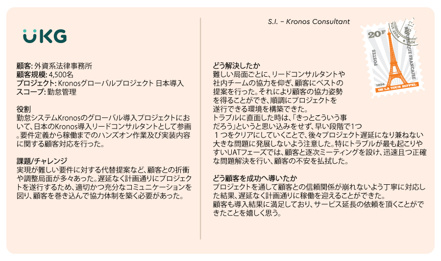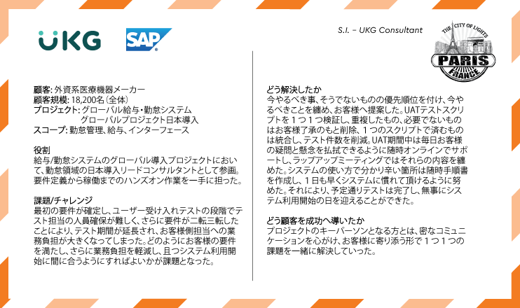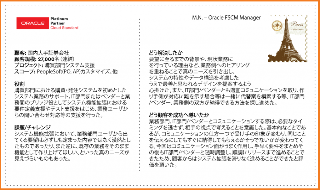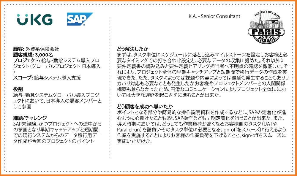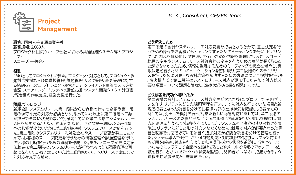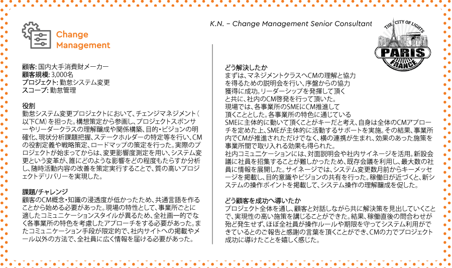 2)人事・タレントマネジメント、ワークフォースマネジメント、財務、サプライチェーン、業務自動化(RPA)領域に関するコンサルティング 3)マネジメントコンサルティング (チェンジマネジメント, プロジェクトマネジメント / PMO, ストラテジー等, Prosci チェンジマネジメント資格認定プログラム) |
