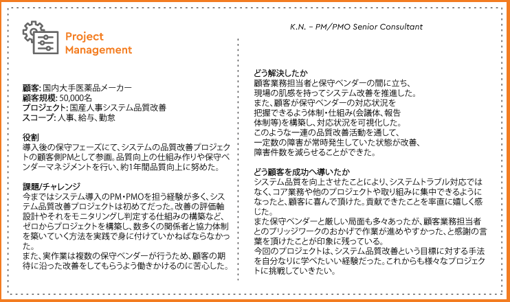 コンサルティングファーム、IT・ソフトウェア企業でのコンサルティング経験、事業会社でのプロジェクト経験 | ||