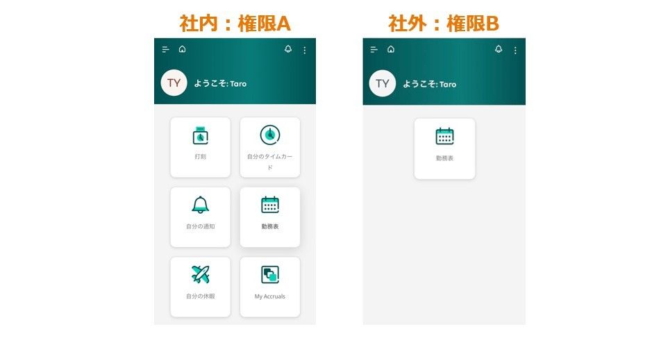 社外からの接続時にはシフト閲覧のみの許可とします。操作権限は社内用(権限A)、社外用(権限B)を作成し、従業員にそれら両方を登録します。